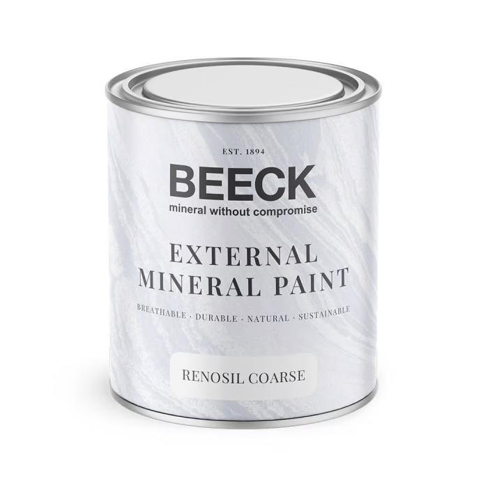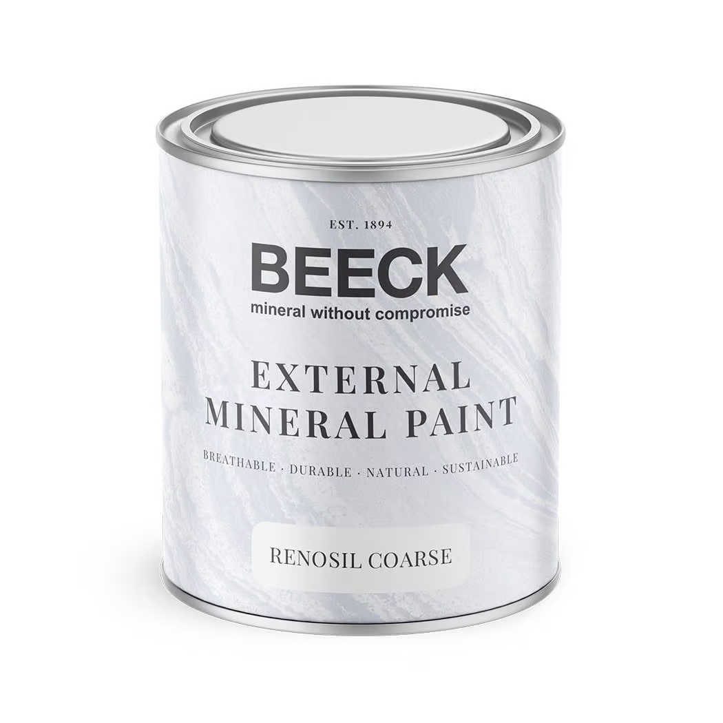 Beeck Renosil Coarse is a vapour permeable silicate-based paint for use when there are a variety of existing paints, surface imperfections, hairline cracks or areas of synthetic resin render. Renosil Coarse is an intermediary coat and levelling primer with a texture grain 0.4mm down which should be coloured the same as the Renosil fine. Can also be applied over weathered firm old emulsion coatings.